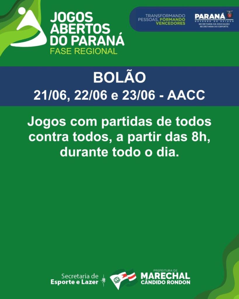 Já de 27 a 30 de junho acontecerão as finais da fase regional dos Jogos Abertos do Paraná. As disputas também acontecerão em Marechal Rondon.