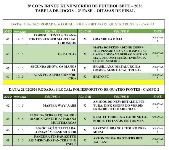 Após cinco rodadas na fase de classificação, com quatro jogos para cada time e a eliminação de quatro equipes, terão início neste sábado (21), no Centro Poliesportivo de Quatro Pontes, as fases mata-mata da 8ª Copa Irineu Kuhn/Sicredi de Futebol Sete, competição promovida pela Associação de Moradores da Linha Água Verde.