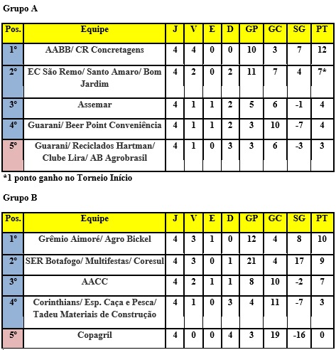 - Grêmio Aimoré/Agro Bickel (1ºB) x (4ºA) Guarani/Beer Point Conveniência