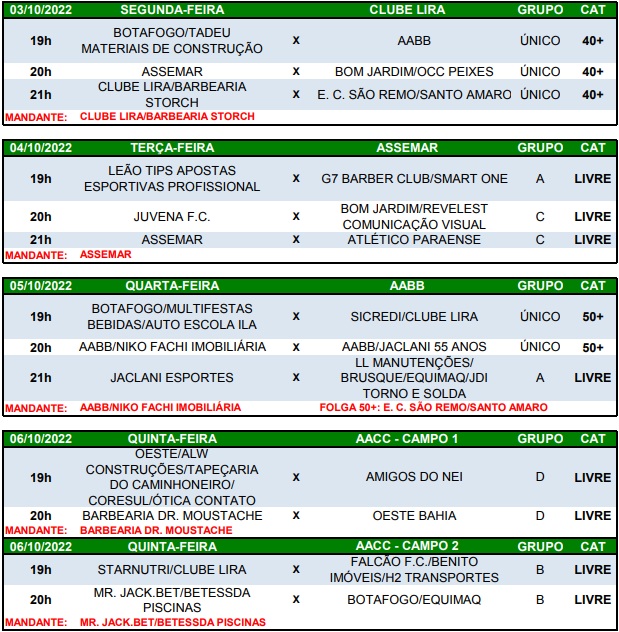 Na terça-feira (04) será a vez da Assemar sediar a 2ª rodada, com três duelos pela categoria Livre. Na quarta-feira (05), a AABB recebe dois confrontos pelo Máster e um pelo Livre, e para fechar a programação da semana, na quinta-feira (06) quatro partidas pelo Livre vão movimentar os campos da AACC.