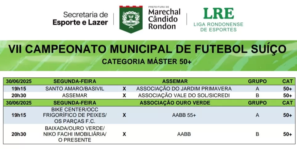 Após o adiamento da 1ª rodada da categoria Máster (50+) na última segunda-feira (23), nesta quarta-feira (25) foi a vez do frio adiar também o início da categoria Veterano (40+) do Campeonato Municipal de Futebol Suíço Veterano (40+) 2025, promovido pela Secretaria de Esporte e Lazer de Marechal Cândido Rondon em parceria com a Liga Rondonense de Esportes.