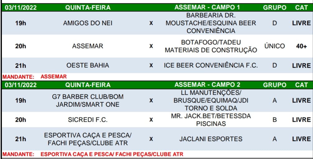 Dentre os destaques da noite está o confronto entre Amigos do Nei e Barbearia Dr. Moustache/Esquina Beer Conveniência, valendo a liderança do grupo D, e a chance da G7 Barber Club encerrar a 1ª fase com 100% de aproveitamento no Grupo A diante da LL Manutenções/Equimmaq/JDI, ambos na categoria Livre, além da tentativa da Assemar se manter viva na briga pela classificação na categoria Veterano diante do Botafogo, que terá um jogo atrasado da 2ª rodada, adiado em razão da chuva.
