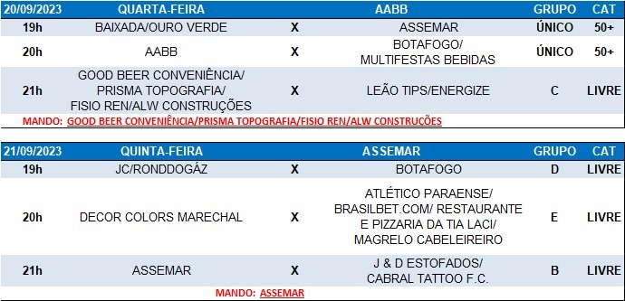 No confronto mais equilibrado da rodada, a AABB derrotou o Clube Guarani/Adair Corretora de Imóveis/Lavacar e Borracharia Panorama por 3 a 2, de virada. Edinilson e Marciano abriram boa vantagem para o Guarani, mas os donos da casa reagiram e buscaram a vitória com gols de Leandro Tufão, duas vezes, e Dinar.