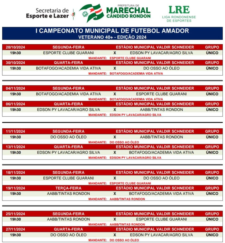 Será aberta logo mais, às 19h30 desta segunda-feira (28), a 1ª edição do Campeonato Municipal de Futebol Veterano, organizado pela Secretaria de Esporte e Lazer de Marechal Rondon.