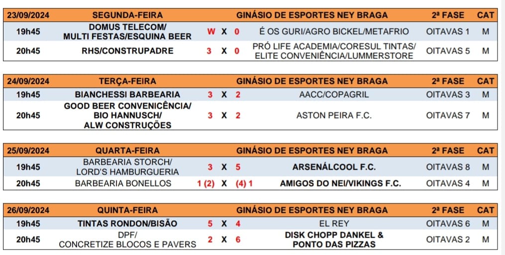 Entre os dias 23 e 26 de setembro, o ginásio Ney Braga recebeu os duelos válidos pela fase oitavas de final do Campeonato Municipal de Futsal 2024, organizado pela Secretaria de Esportes e Lazer de Marechal Cândido Rondon.