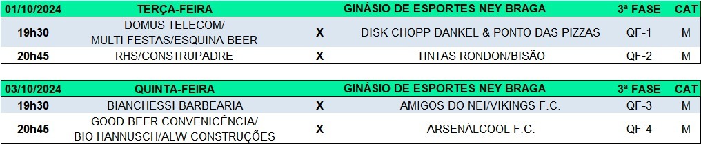 As quatro rodadas duplas definiram os oito times que seguem busca do título: Domus Telecom/Esquina Beer/Multifestas, RHS/Construpadre, Bianchessi Barbearia, Good Beer Conveniência/Bio Hannusch/ALW Construções, Arsenálcool FC, Amigos do Nei/Vikings FC, Tintas Rondon/Bisão e Disk Chopp Dankel/Ponto das Pizzas.
