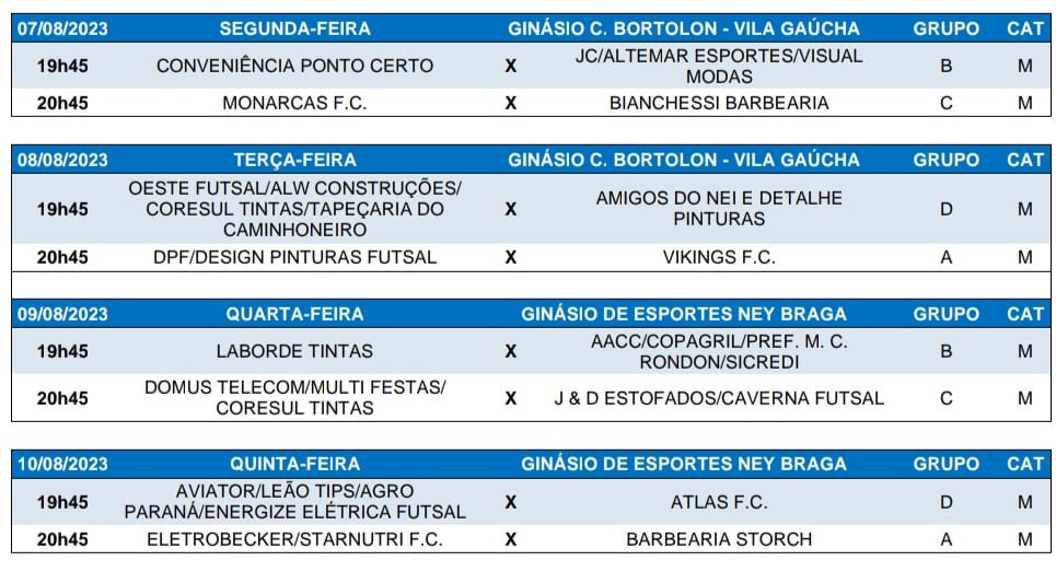 Serão disputadas nesta semana, desta segunda-feira (7) até quinta-feira (10) as rodadas finais da 1ª fase do Campeonato Municipal de Futsal Masculino 2023, organizado pela Secretaria de Esportes e Lazer de Marechal Rondon.