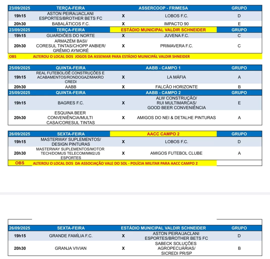 A segunda semana do Campeonato Municipal de Futebol Suíço Livre, organizado pela Secretaria de Esportes e Lazer de Marechal Cândido Rondon, será repleta de partidas válidas pela fase de classificação. Serão 12 confrontos entre esta terça-feira (23), quinta (25) e sexta-feira (26), nos campos da Assercoop/Frimesa, estádio Valdir Schneider, AABB e AACC.