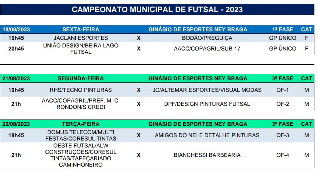 Foram conhecidos na quinta-feira (17), no ginásio Ney Braga, em Marechal Cândido Rondon, os dois últimos classificados para a fase quartas de final do Campeonato Municipal de Futsal Masculino 2023, organizado pela Secretaria de Esportes e Lazer de Marechal Rondon.