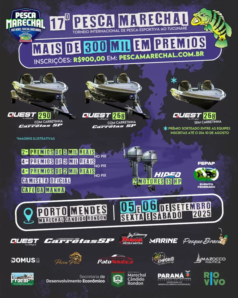Um dos eventos mais aguardados do calendário de pesca esportiva nacional já tem data marcada: o 17º Pesca Marechal – Torneio Internacional de Pesca Esportiva ao Tucunaré acontece nos dias 5 e 6 de setembro, no distrito turístico de Porto Mendes, em Marechal Cândido Rondon.