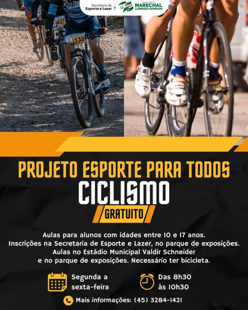 A Secretaria de Esporte e Lazer de Marechal Cândido Rondon, por meio do Projeto Esporte para Todos, oferece aulas gratuitas de ciclismo nas categorias MTB e SPEED, para jovens entre 10 e 17 anos, de ambos os sexos.