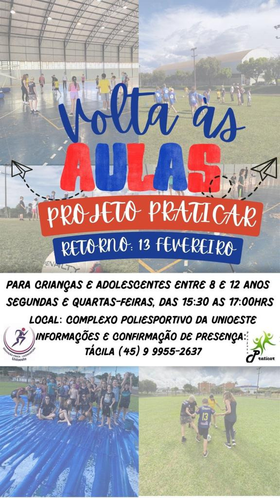 Na próxima segunda-feira (13), serão retomadas as aulas do Projeto Praticar na Universidade Estadual do Oeste do Paraná (Unioeste), campus Marechal Cândido Rondon. A proposta é destinada para crianças e adolescentes entre 8 e 12 anos, que estejam matriculados em séries do ensino fundamental de escolas públicas.