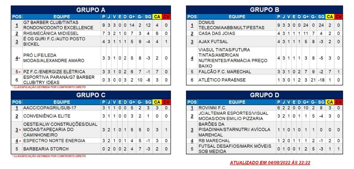 Quatro partidas encerraram na quinta-feira (4) a quarta semana de disputas da 1ª fase do Campeonato Municipal de Futsal de Marechal Cândido Rondon, promovido pela Secretaria de Esporte e Lazer.