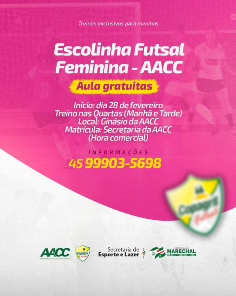 Para as meninas que estão na faixa etária de 14 a 17 anos interessadas em treinar futsal e fazer parte da equipe de rendimento da AACC Copagril/Prefeitura de Marechal Rondon que irá disputar competições regionais e os Jogos da Juventude, os treinamentos acontecem às segundas e quartas-feiras, às 18 horas, no ginásio Ney Braga.