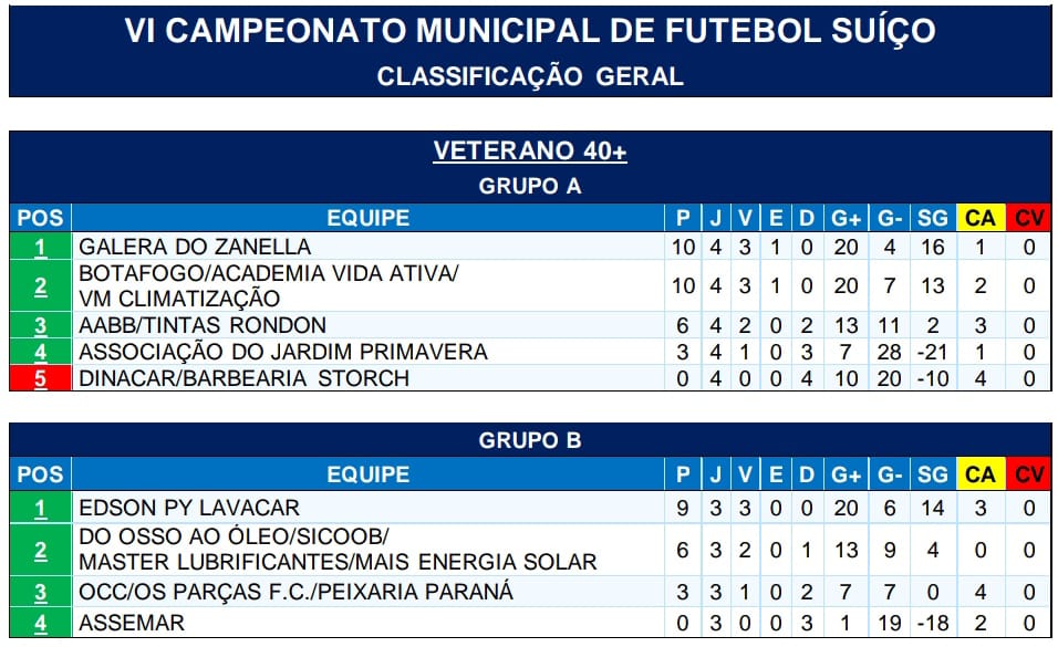 Já no campo da AABB/Tintas Rondon, os donos da casa foram superados pela Galera do Zanella/Hotel Bender por 3 a 2, no duelo que valia a liderança do Grupo A. Em seguida, o Botafogo/Academia Vida Ativa/VM Climatização atropelou a Associação Jardim Primavera por 7 a 0.