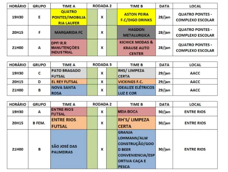 A partir das 19h30, três partidas irão movimentar a fase de classificação. Na preliminar, os donos da casa, Quatro Pontes/Imobiliária Laufer, enfrentam o Aston Peira/Digo Drinks, pelo Grupo E. Em seguida, jogam Margarida e Hagdon Metalúrgica, pelo Grupo F. No fechamento da rodada, a DPF/Design Pinturas/R.R. Manutenções Industrial encara a Kichik Modas/Krause Auto Center, no duelo entre duas equipes que já estrearam no Grupo A.