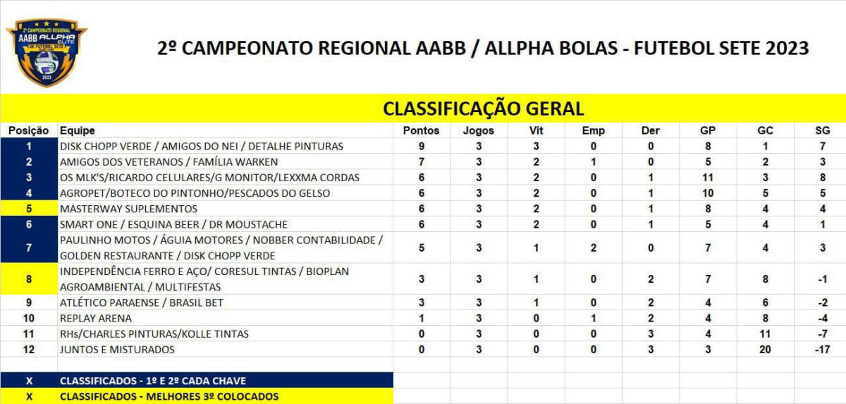 Foi encerrada no último sábado (21), com a realização de seis partidas, a fase de classificação do 2º Campeonato Regional AABB/Allpha Bolas Futebol Sete, definindo os oito classificados que avançaram para as quartas de final da competição.