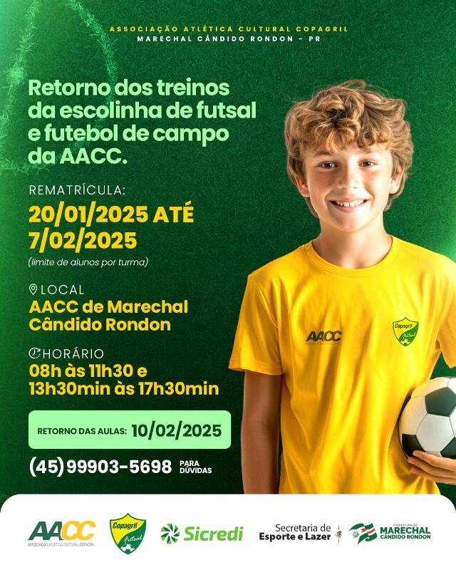 Em 2025, as atividades na sede da AACC, em Marechal Cândido Rondon, iniciam no dia 10 de fevereiro. Em seguida, serão retomados os treinos nos polos de Porto Mendes, Margarida, Iguiporã, Novo Três Passos e Vila Gaúcha.