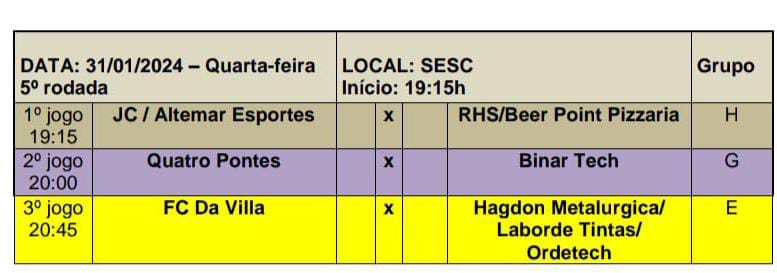 Teve sequência nesta terça-feira (30), com a realização da 4ª rodada, a fase de classificação da Copa SESC Verão de Futsal Masculino 2024. Nas três partidas disputadas no ginásio do SESC Marechal, 19 gols foram assinalados, média superior a seis por jogo.
