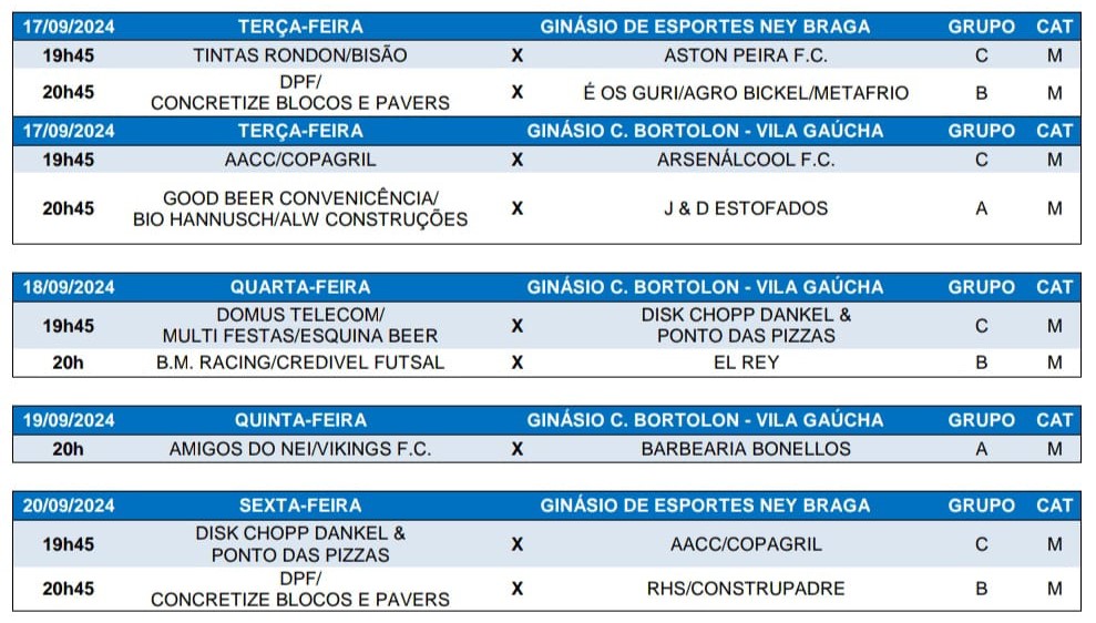 Em seguida, no duelo que valia a liderança do Grupo B, a RHS/Construpadre, com dois gols de Douglinhas e outro de Murilove, derrotou a Barbearia Storch/ Lord’s Hamburgueria, que marcou com Gabriel Hoffsteder e Kaufmann, por 3 a 2, e manteve o 100% de aproveitamento no certame.
