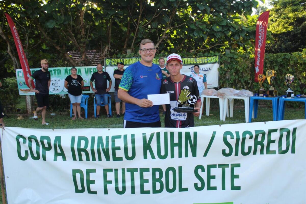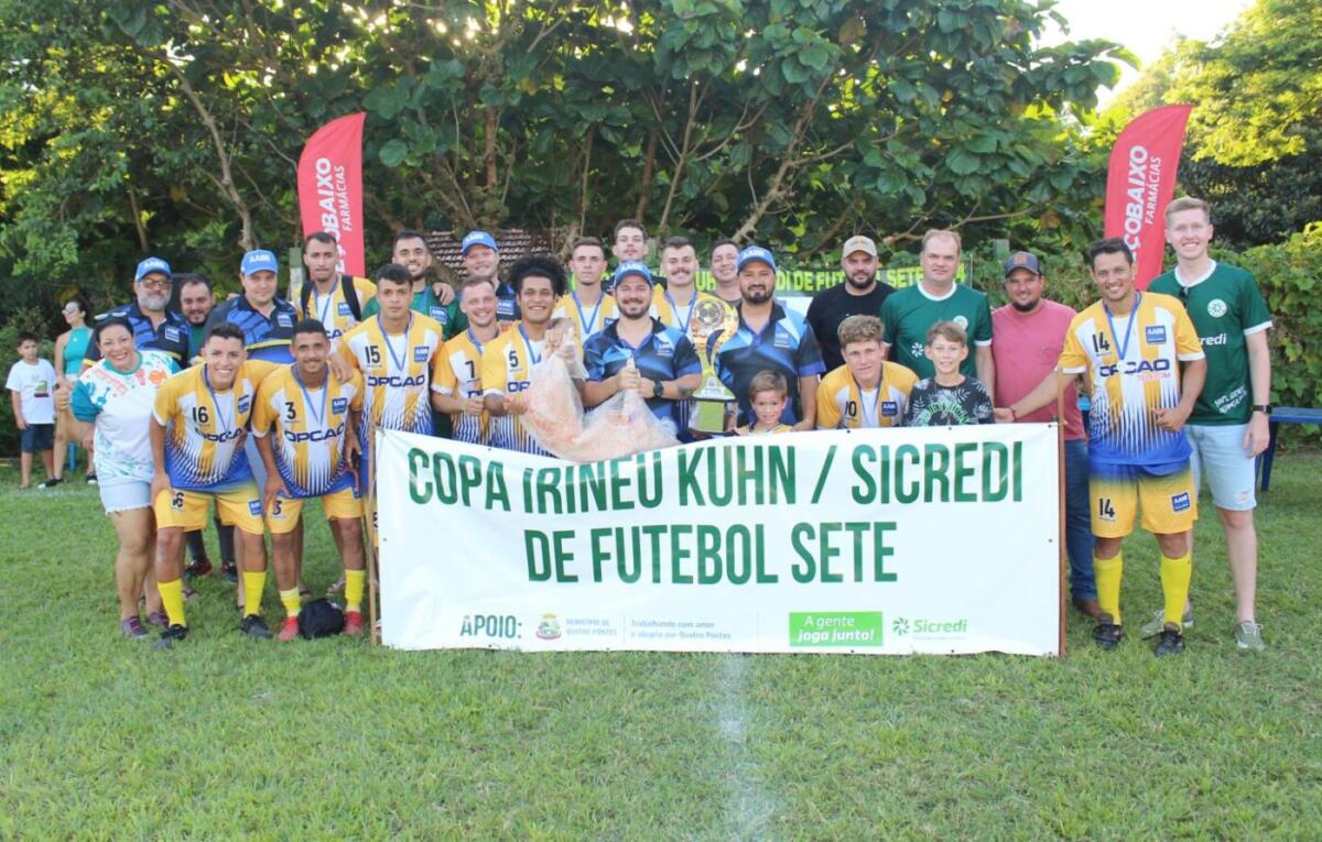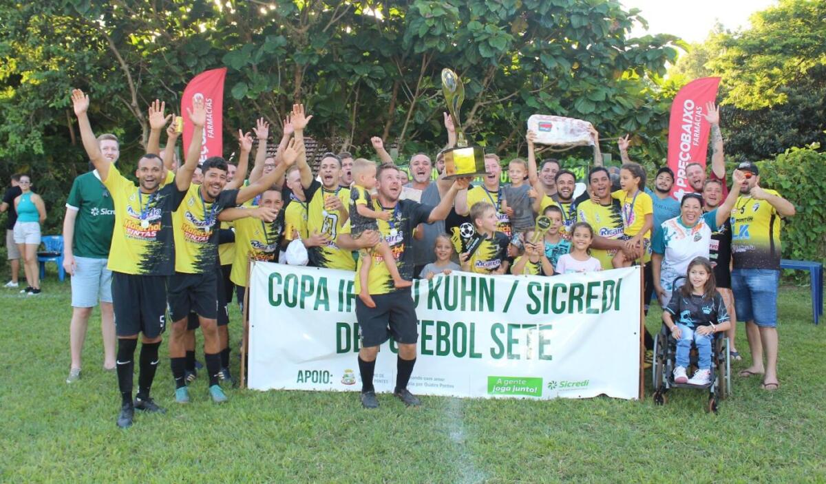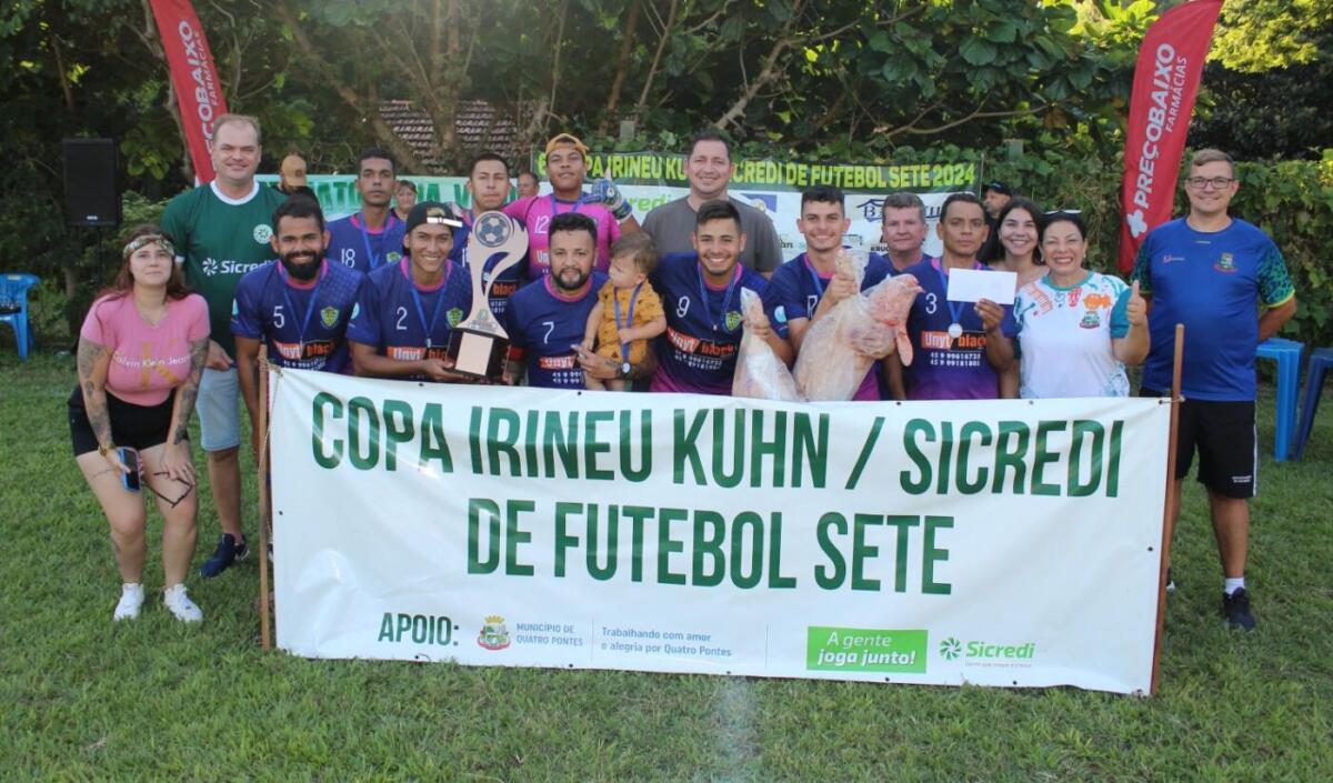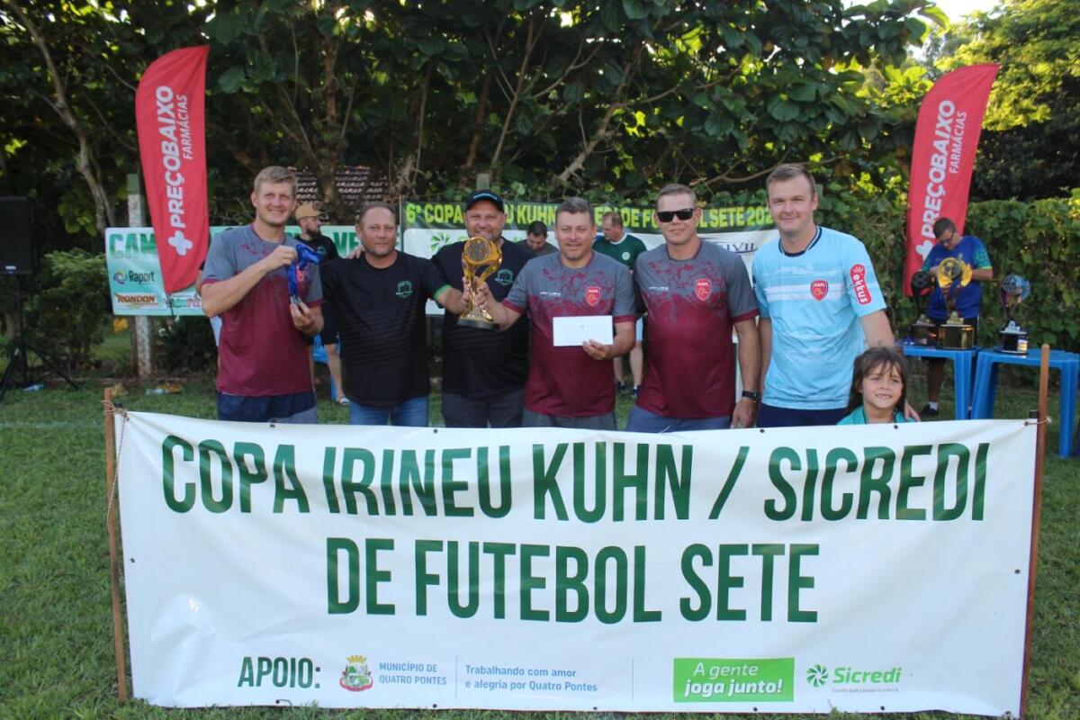 A taça da Copa Irineu Kuhn/ Sicredi de Futebol Sete vai continuar em Quatro Pontes. Neste sábado (17), com grande presença de torcedores, dirigentes autoridades e patrocinadores no campo da Associação de Moradores da Linha Água Verde, o Ricardo Celulares/ Marechal Tintas/ Souza Madeiras/ Arena Miami Beach Tennis repetiu o feito do ano passado e venceu a AABB/ Disk Chopp Verde, desta vez nos pênaltis, por 2 a 1, após empate por 2 a 2 no tempo normal, e conquistou seu terceiro título seguido do torneio.