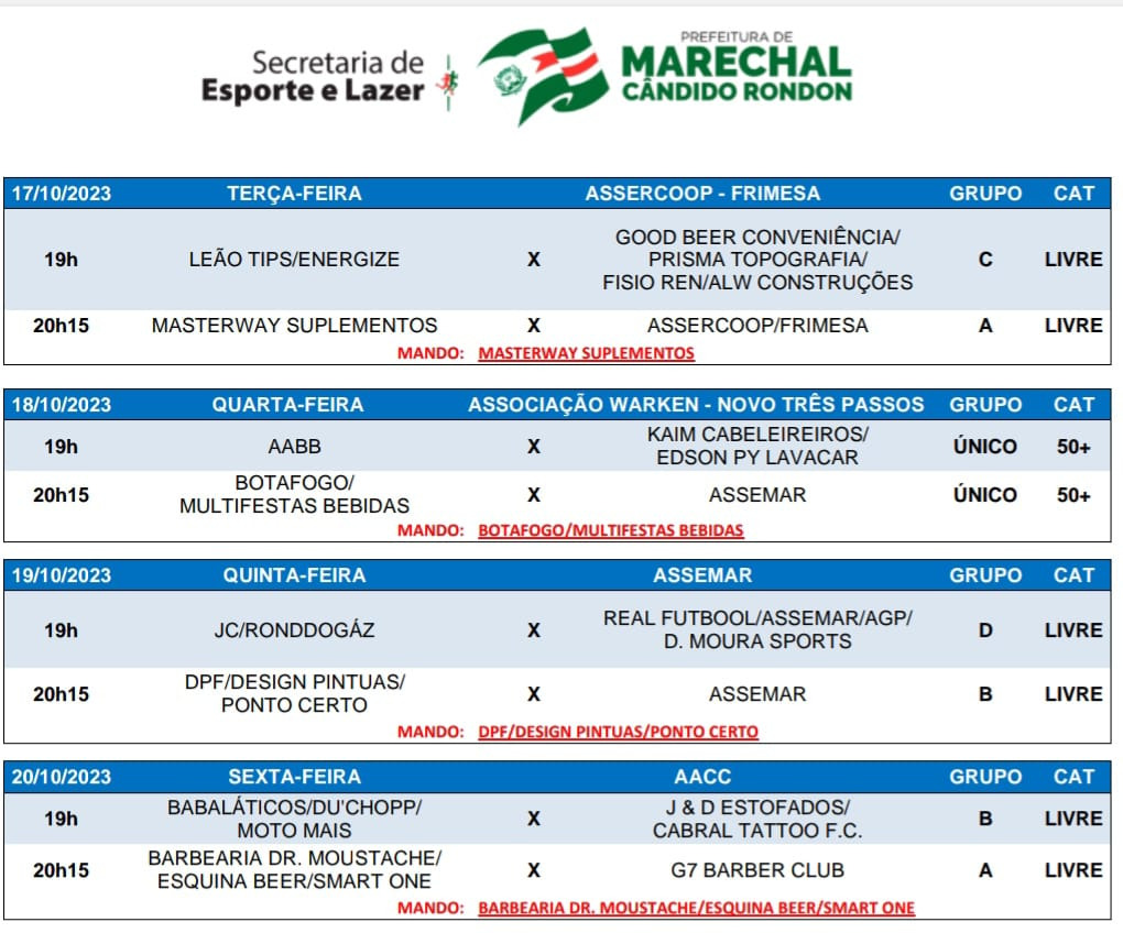 Em seguida, no confronto direto pela 4ª posição, Clube Lira/Barbearia Storch, com gols de Pintado e Flavio, e Clube Guarani/Adair Corretora de Imóveis/Lavacar e Borracharia Panorama, com gols de Edinilson e Odirlei Pequeno, também ficaram no empate por 2 a 2.