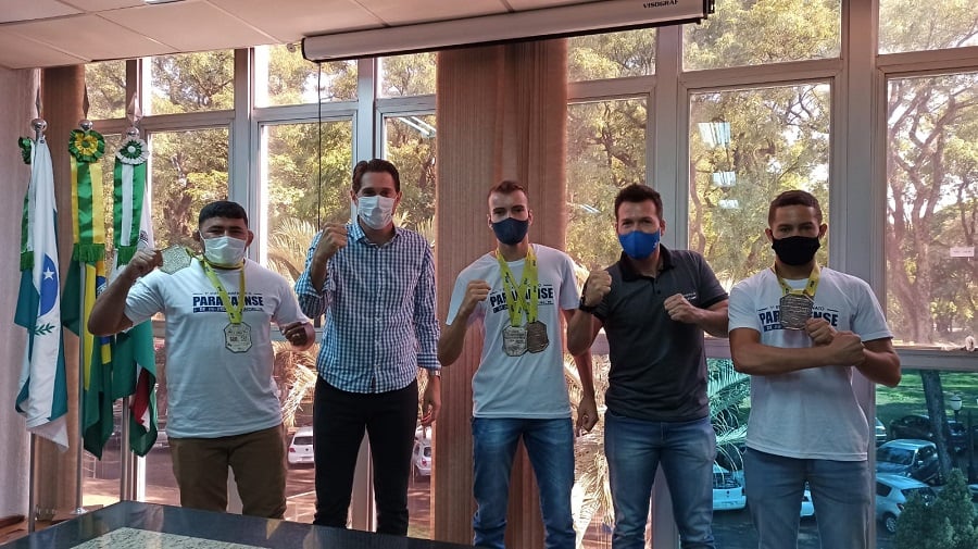 Ângelo, Felipe e Henrique estiveram reunidos com o prefeito Marcio Rauber e com o secretário municipal de Esporte e Lazer, Diogo Schneider, nesta manhã de terça-feira (25). Eles apresentaram as medalhas conquistadas na etapa inicial do Paranaense.