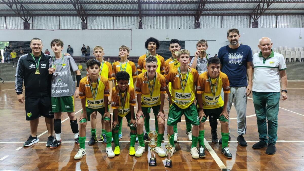 Foi encerrada na chuvosa manhã deste domingo (8), no ginásio do Colégio Rui Barbosa, a 3ª edição da Copa Karl Schmidt de Futsal, competição organizada pela Secretaria de Esporte e Lazer de Marechal Cândido Rondon que reuniu 25 equipes e diversas agremiações esportivas do município nas categorias sub-8, 10, 12 e 14. O homenageado da competição, Karl Schmidt, um dos maiores nomes da história do esporte rondonense, estava mais uma vez presente na entrega das premiações.
