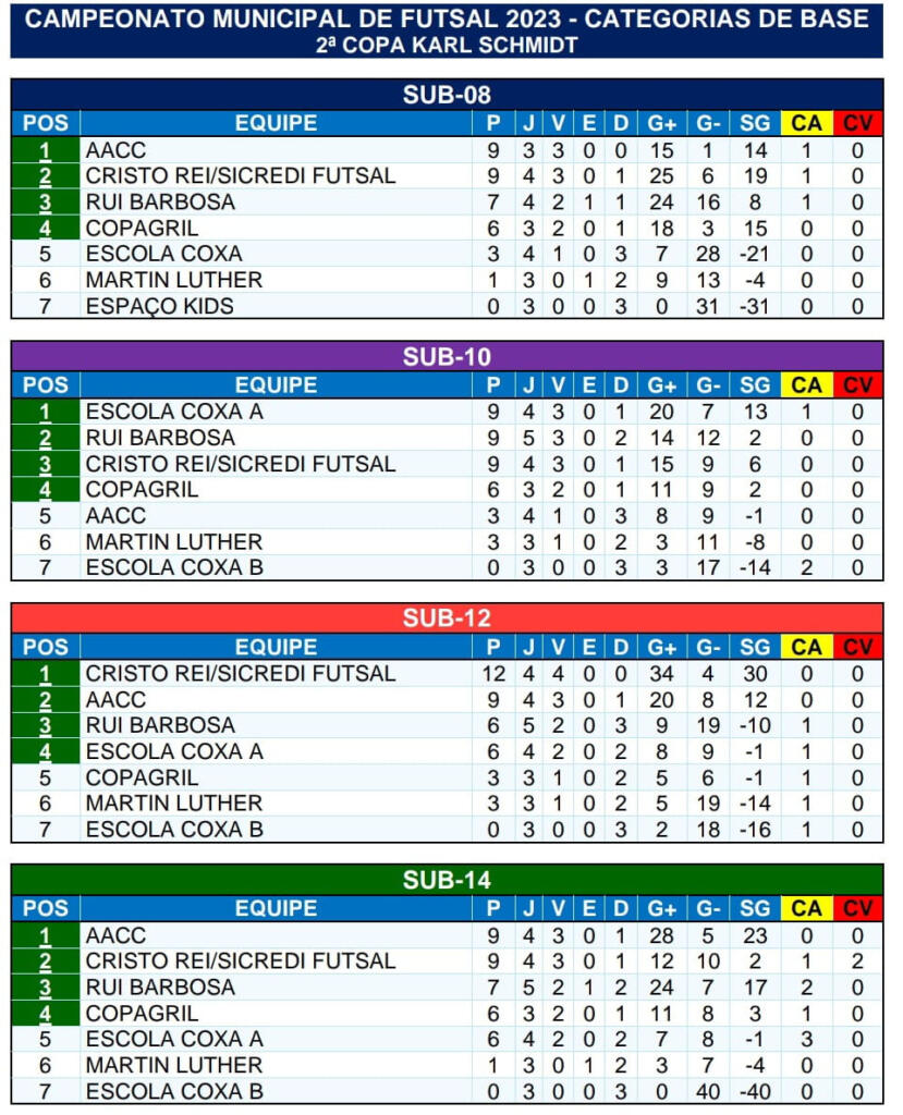 Com tranquilidade, os donos da casa, comandados pelo técnico Jean Model venceram o Espaço Kids, no sub-8, por 11 a 0, e a Escola Coxa B nas demais categorias, por 7 a 2 (sub-10), 6 a 0 (sub-12) e 18 a 0 (sub-14).