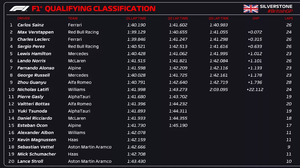 Pela primeira vez em oito anos de carreira na F1, Carlos Sainz vai largar da primeira posição em uma corrida. O espanhol da Ferrari conquistou a pole position na classificação do GP da Inglaterra no sábado (02), debaixo de muita chuva, e em seu 150º GP na categoria. O tempo de sua melhor volta foi de 1m40s983 nos pneus intermediários contra 1m41s055 de Max Verstappen, com quem vai dividir a primeira fila.