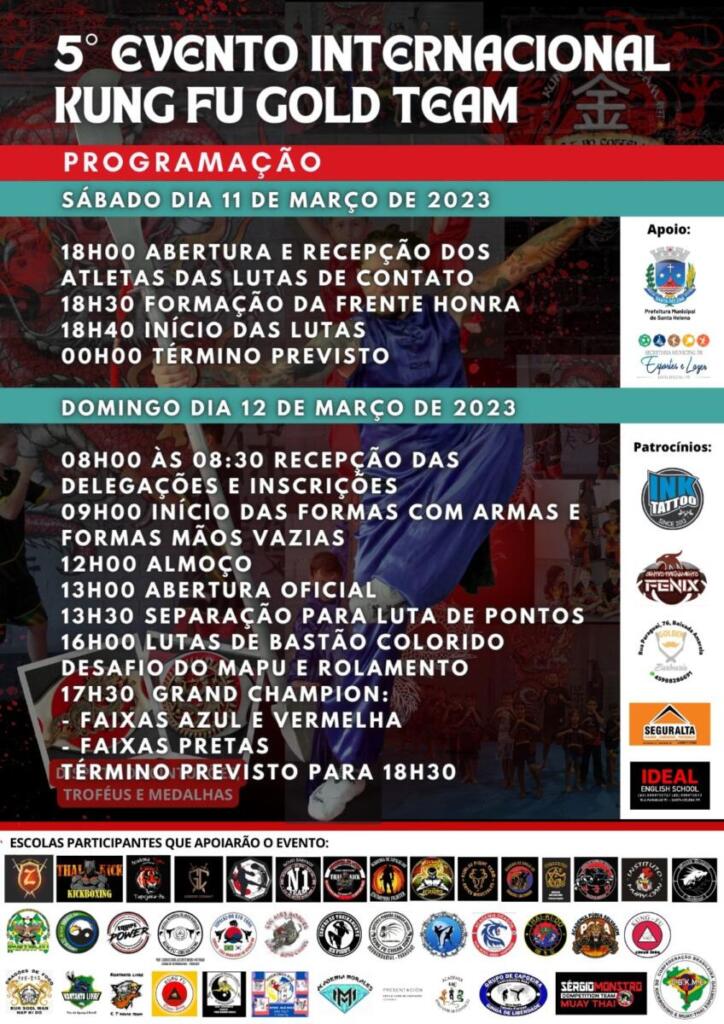 Nos dias 11 e 12 de março, Santa Helena sediará o 5º Evento Internacional de Kung Fu Gold Team, no Balneário Terra das Águas. O evento conta com o apoio da administração municipal, através da Secretaria Municipal de Esportes e Lazer. A programação terá início no dia 11 (sábado), às 18 horas, com abertura e recepção dos atletas das lutas de contato e segue até a meia noite. Para o dia 12 (domingo) a programação está prevista para as 08 horas com a recepção das delegações e inscrições.