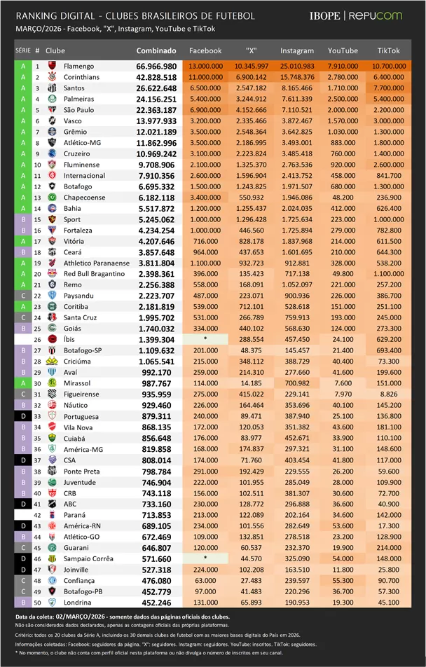 Na edição atual do Ranking Digital dos Clubes Brasileiros do IBOPE Repucom, destacam-se os resultados de Santos, Corinthians, Flamengo, Palmeiras e Grêmio. Estes cinco foram os que registraram os maiores saldos de inscrições em suas redes sociais em fevereiro ao somarem, juntos, mais de 1,1 milhão de novas inscrições.