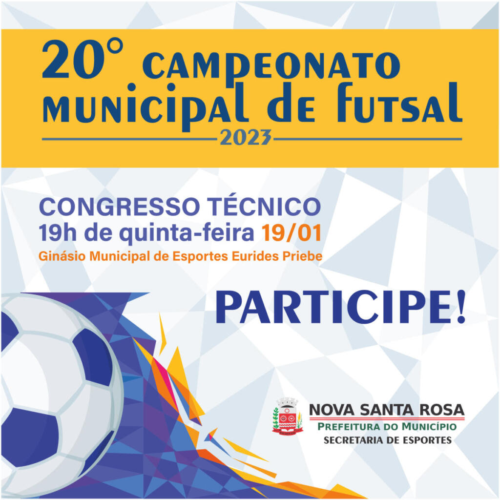 A Prefeitura de Nova Santa Rosa, por meio da Secretaria de Esportes, convida os atletas do município para participarem do 20° Campeonato Municipal de Futsal 2023, promovido pelo Departamento de Esportes.