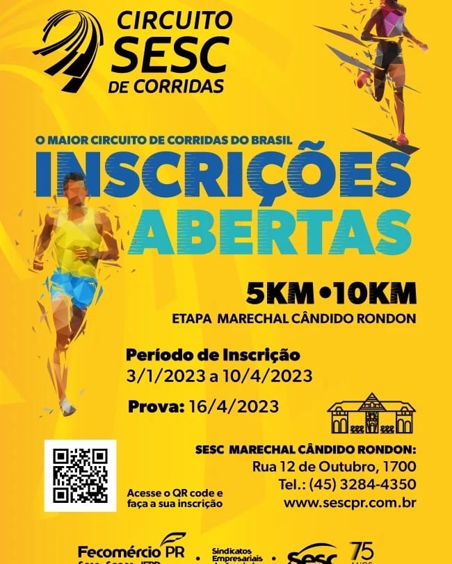 As inscrições devem ser feitas até 11 de abril, através do site (clique aqui). Os atletas que disputarem a corrida precisam enviar atestado médico para o e-mail atestados.mcrondon@sescpr.com.br. Mais informações podem ser obtidas pelo telefone (45) 3284-4350.