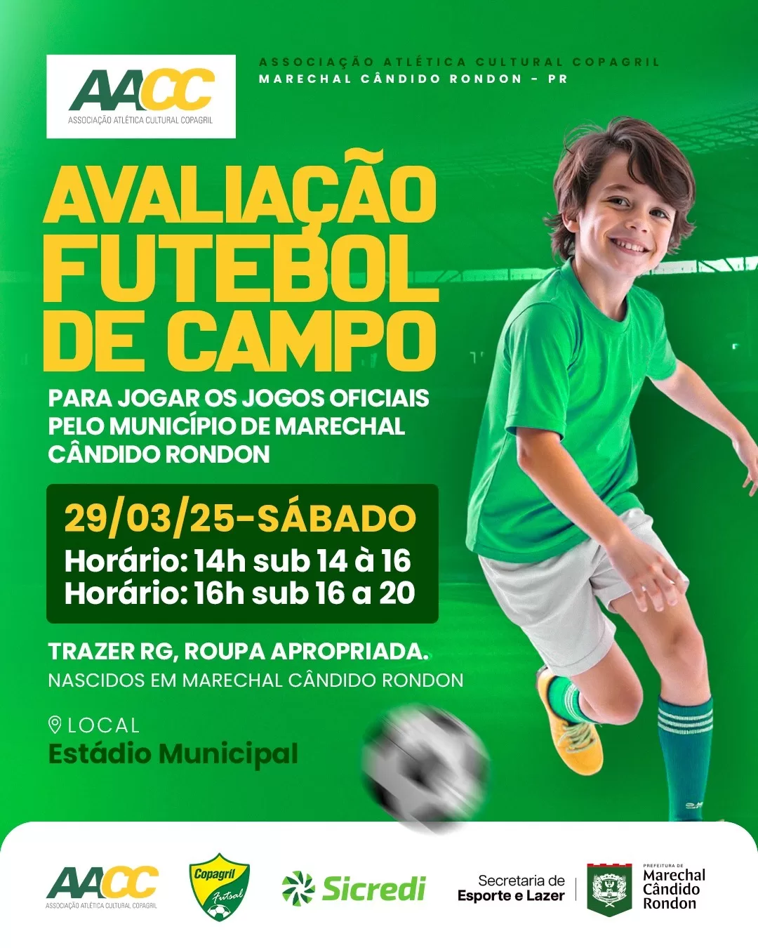 Será realizada neste sábado (29), no estádio Valdir Schneider, uma seletiva para a formação das equipes sub-17 e sub-21 que irão representar Marechal Cândido Rondon nos Jogos da Juventude e Paraná Bom de Bola 2025, respectivamente.