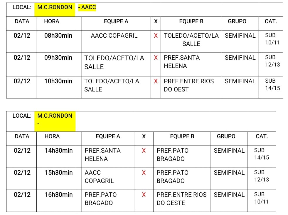 Na programação deste sábado, as equipes de Pato Bragado e Toledo/Aceto/La Salle estarão representadas nas três categorias, enquanto AACC Copagril, Santa Helena e Entre Rios do Oeste estarão presentes na semifinal com duas equipes.