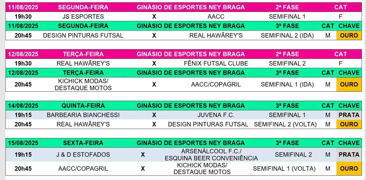 Na outra semifinal, AACC Copagril e Kichik Modas/Destaque Motos farão o duelo de ida amanhã (12). A volta acontece na sexta-feira (15).