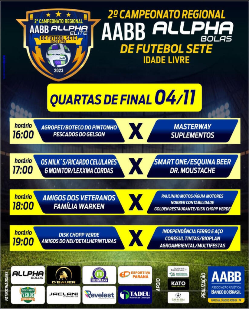 O sábado (4) promete fortes emoções na Associação Atlética Banco do Brasil (AABB) de Marechal Cândido Rondon. A partir das 16 horas, quatro partidas vão movimentar as quartas de final do 2º Campeonato Regional AABB/Allpha Bolas Futebol Sete.