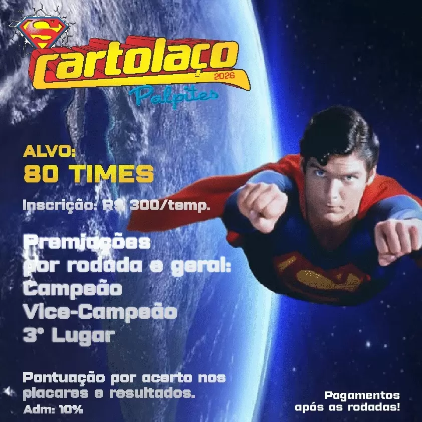 Além das ligas no Cartola, outra opção para quem gosta de cravar os resultados do Brasileirão é o Super CARTOLAÇO Palpites 2026, com premiação a cada rodada para quem somar o maior número de acertos dos placares, ao valor de R$ 300 para todo o Brasileirão.