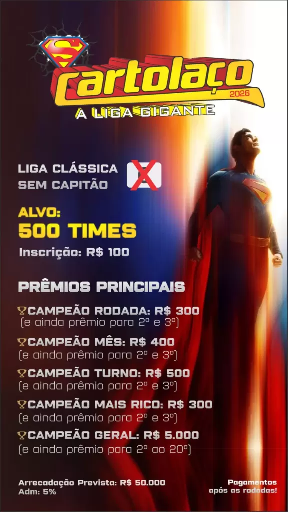 Com elevadíssimo índice de aprovação dos participantes, o Super CARTOLAÇO 2026 terá novamente duas opções de ligas para os cartoleiros do todo o país e também do exterior, a Com Capitão, com valor da inscrição de R$ 200, e Sem Capitão, ao valor de R$ 100.