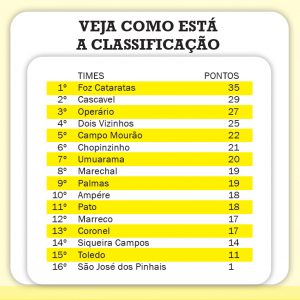 Na parte de cima da tabela, Foz Cataratas, Cascavel e Operário Laranjeiras já garantiram suas vagas entre os quatro primeiros e vão diretamente para a 3ª fase, as quartas de final. A última vaga será decidida entre Dois Vizinhos e Campo Mourão.