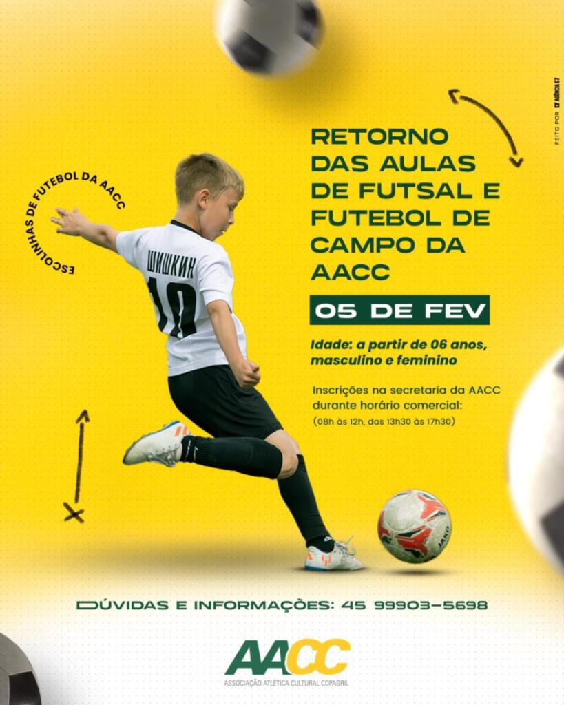 Estão abertas as inscrições para os treinamentos das escolinhas de futsal e futebol da AACC para a temporada 2024. Neste ano, as vagas para as diversas categorias, de 6 a 17 anos, nos naipes masculino e feminino, serão limitadas, como forma de garantir a qualidade dos treinamentos para todos os alunos matriculados.