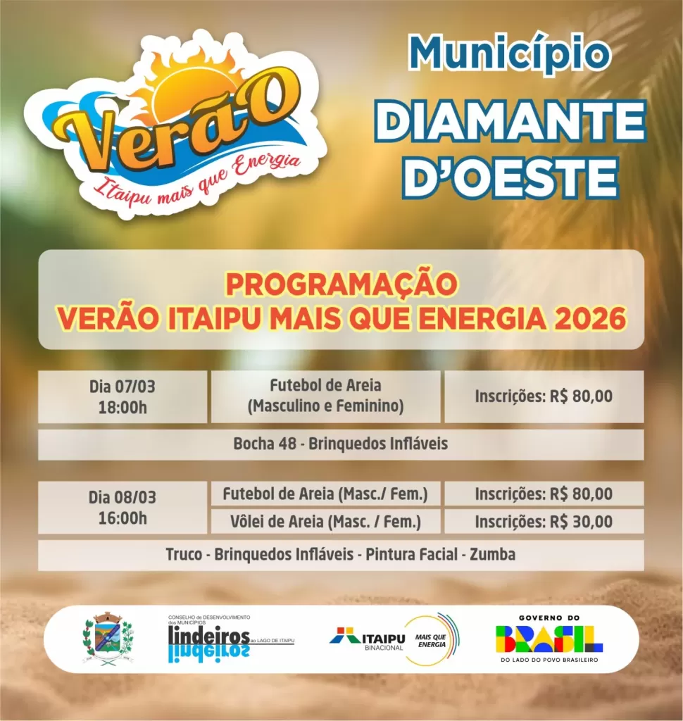 Diamante D’Oeste terá futebol de areia, masculino e feminino, no sábado (7), a partir de 18 horas (inscrições R$80), juntamente com bocha 48 e brinquedos infláveis. No domingo (8), a partir de 16 horas, serão realizados os jogos de futebol de areia, masculino e feminino (inscrições R$80) e vôlei de areia, masculino e feminino (inscrições R$30), além de truco, zumba, pintura facial e brinquedos infláveis.