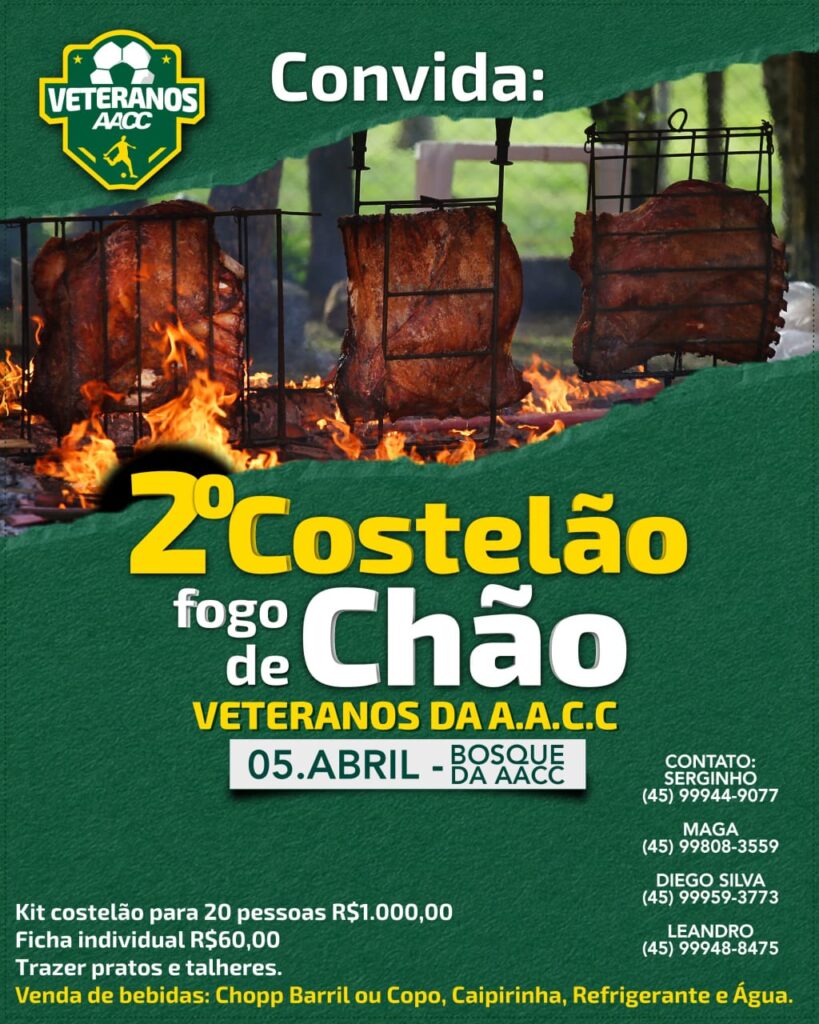 No dia 5 de abril, o grupo de Veteranos da AACC irá promover a 2ª edição do Costelão Fogo de Chão, evento que foi sucesso absoluto no ano passado. O kit Costelão, para 20 pessoas, está sendo comercializado ao valor de R$ 1 mil, enquanto a ficha individual custa R$ 60.