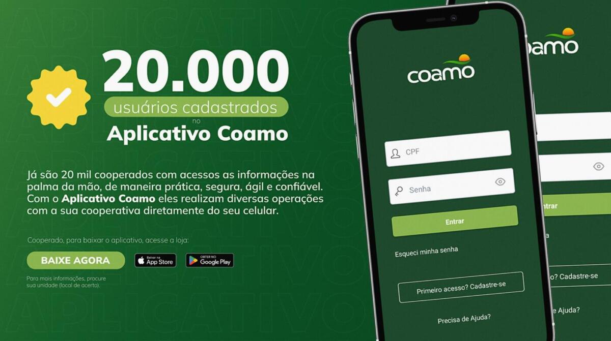 A qualidade e a inovação consistente são valores da Coamo. Acompanhando a evolução, a cooperativa lançou em 2021 o seu aplicativo, que se tornou um novo canal de relacionamento e propiciou mais proximidade e interação dos negócios dos cooperados com a Coamo. Neste 15 de abril, a Coamo alcançou a marca de 20 mil usuários do Aplicativo Coamo, que fornece aos cooperados Informações na palma da mão, de maneira segura, ágil e confiável.