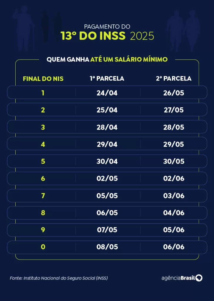 Com previsão de injetar R$ 73,3 bilhões na economia, a antecipação do décimo terceiro do INSS será paga em duas parcelas. A segunda parcela vai de 26 de maio a 6 de junho. As datas são definidas com base no dígito final do Número de Inscrição Social (NIS) e com base na renda do beneficiário. Quem ganha apenas o salário mínimo começa a receber antes de quem recebe mais que o mínimo.