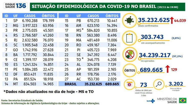 Com as novas informações, o total de pessoas infectadas pelo novo coronavírus durante a pandemia é de 35.232.625.
