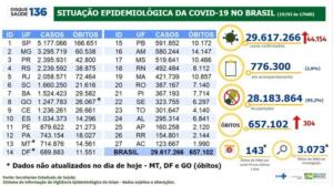 O Brasil registrou, desde o início da pandemia, 657.102 mortes por covid-19, conforme mostra o boletim epidemiológico divulgado ontem (19) pelo Ministério da Saúde. O número total de casos confirmados da doença chegou a 29. 617.266.