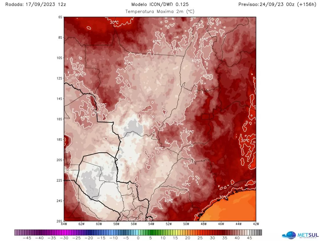 Uma massa de ar extremamente quente vai cobrir o Brasil nos próximos dias. Já faz muito calor neste começo de semana no Centro-Oeste e no Sudeste, mas na segunda metade da semana a massa de ar se reforça ainda mais com temperatura atipicamente elevadas, mesmo calor intenso não sendo incomum nestas áreas do território nacional no mês de setembro. Trata-se de uma situação de elevado perigo pela severidade do calor esperado e que demandará atenção das autoridades.