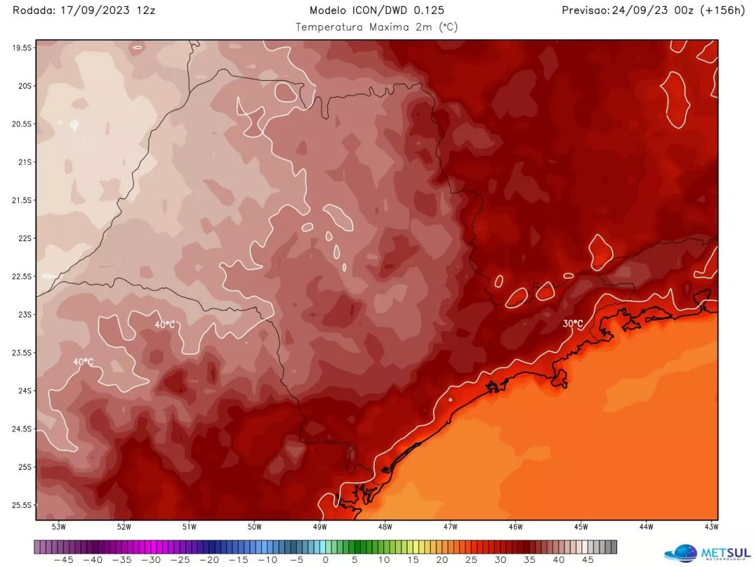 A MetSul Meterorologia adverte para um episódio excepcional de calor em grande parte do Brasil nos próximos dias. As marcas esperadas entre esta semana e a próxima vão superar em muitos os valores médios históricos de temperatura máxima em todas as cinco regiões do país com alto potencial de quebras de recordes para o mês de setembro e talvez até absolutos.